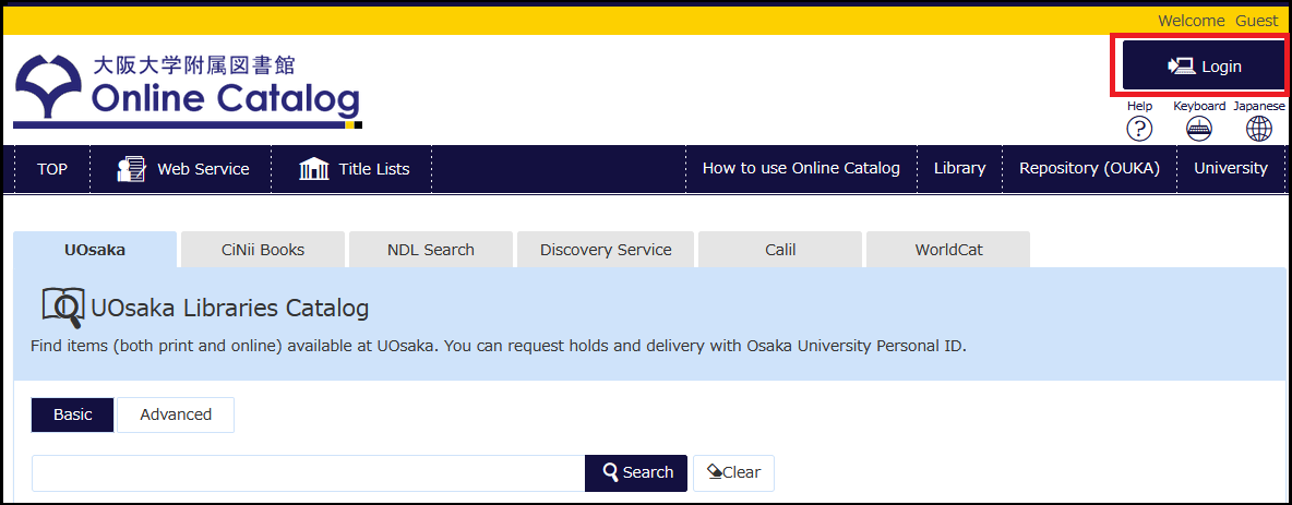 - Catalog (Basic Search): You can search information of books and journals held by the University of Osaka, regardless of paper and electronic materials.