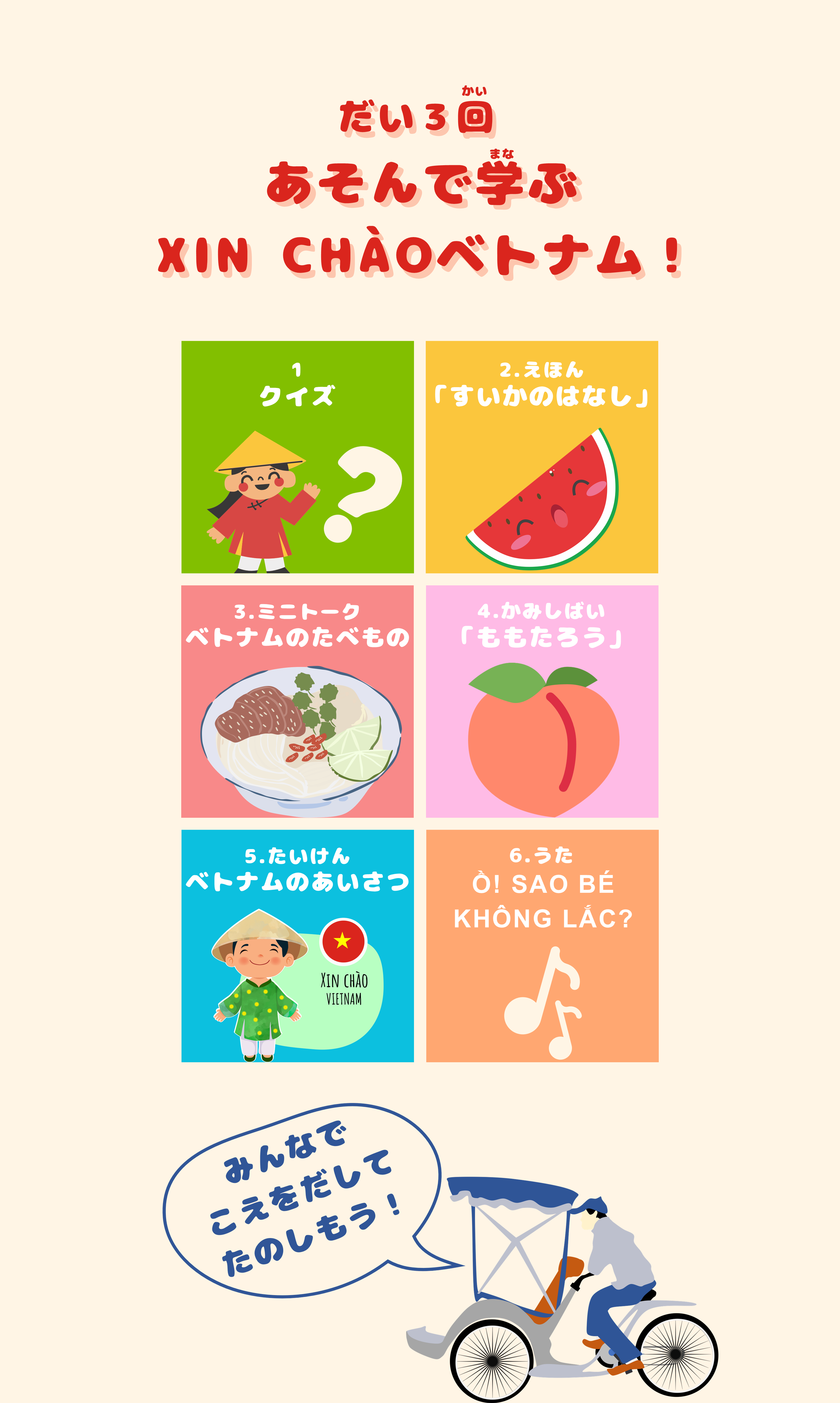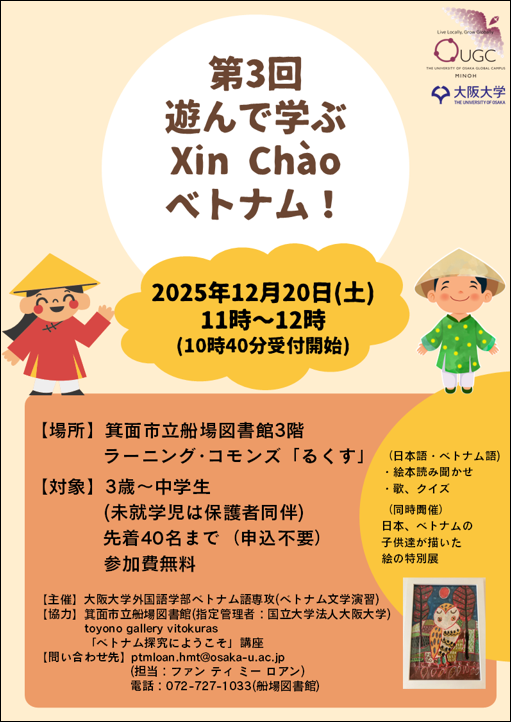シンチャオ!大阪大学ベトナム語専攻の学生と一緒にベトナムの文化や言語に触れてみませんか?読み聞かせやクイズを通してベトナムの世界を一緒に楽しみましょう。※内容詳細はこのページのチラシ画像をご覧ください。