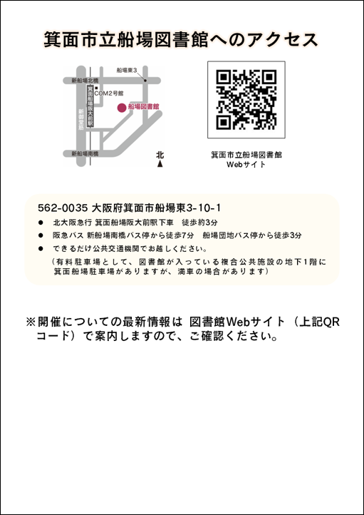 | 場所 | 箕面市立船場図書館(指定管理者 大阪大学)3階 ラーニング・コモンズるくす 〒562-0035 大阪府箕面市船場東3丁目10番1号 (アクセス) ※箕面船場阪大前駅から徒歩3分。 |
