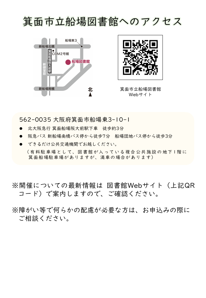 | 場所 | 箕面市立船場図書館 3階 AVコモンズ 〒562-0035 大阪府箕面市船場東3丁目10番1号 (アクセス) ※箕面船場阪大前駅から徒歩3分。 |