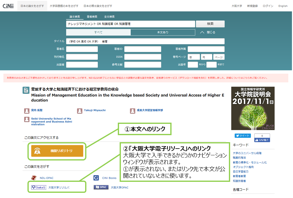 大阪大学 Discovery Service(まとめて検索)冊子の資料、電子ジャーナル・電子ブック、各種文献データベース、大阪大学の学術成果物を集積した機関リポジトリを一括して調べることができます。何から始めればよいかわからないときなど、大阪大学Discovery Service